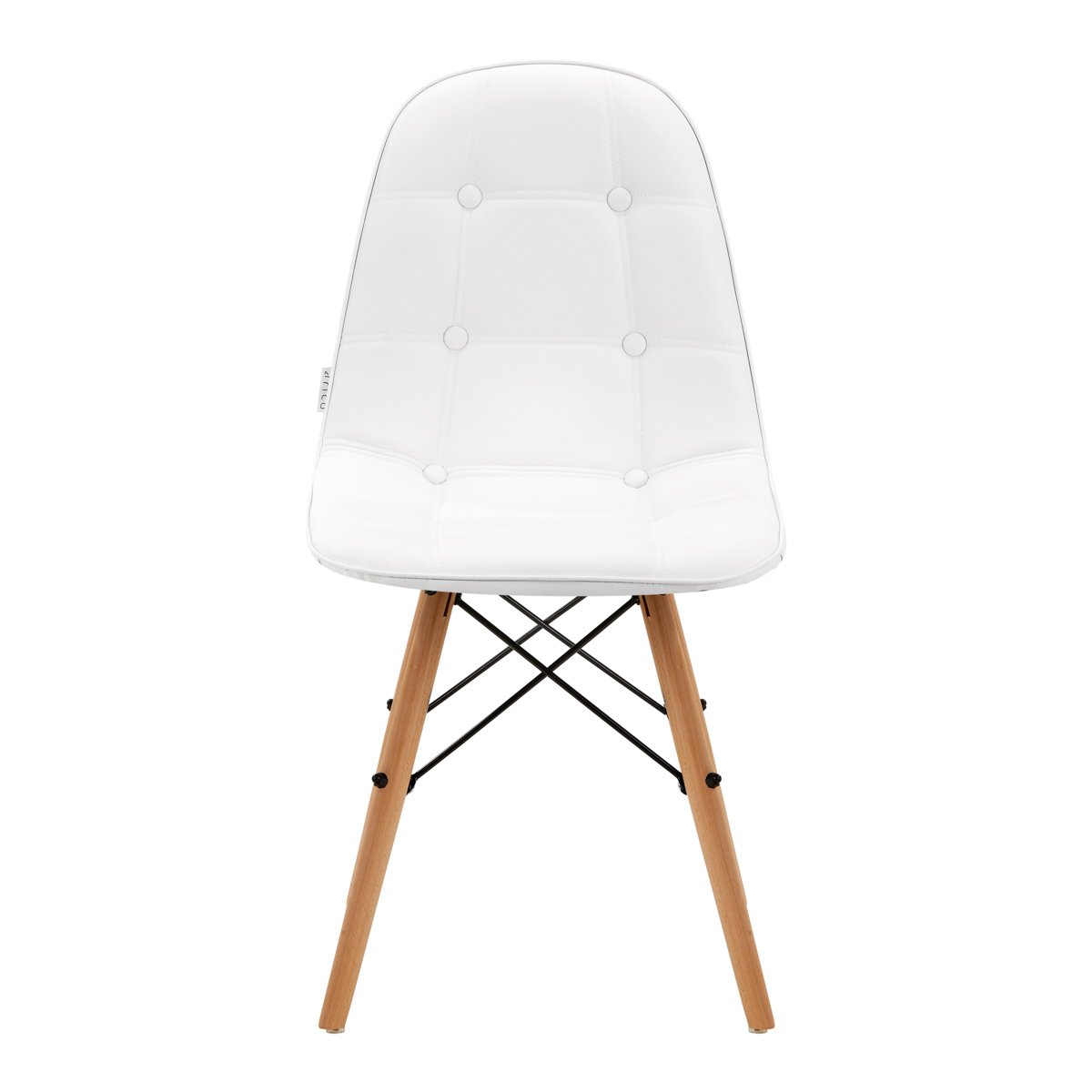 Το κάθισμα είναι γεμισμένο με αφρό και καλύπτεται με ταπετσαρία από ευχάριστο στην αφή συνθετικό δέρμα σε αποχρώσεις του λευκού, το οποίο καθαρίζεται πολύ εύκολα. Μικροί λεκέδες και βρωμιά μπορούν εύκολα να αφαιρεθούν με ένα ελαφρώς βρεγμένο πανί. Το αισθητικό καπιτονέ και οι προσεγμένες ραφές προσδίδουν μια κομψή πινελιά, ενώ το μεταλλικό πλαίσιο σε αποχρώσεις του μαύρου προσθέτει σταθερότητα στα έπιπλα. Τα ματ φινιρισμένα πόδια έχουν πλαστικές προστασίες, προστατεύοντας επιπλέον από τυχαίες ζημιές. Η καρέκλα σε σκανδιναβικό στιλ είναι ένα άνετο έπιπλο που θα γίνει διακοσμητικό στοιχείο στον χώρο υποδοχής οποιουδήποτε ινστιτούτου αισθητικής.