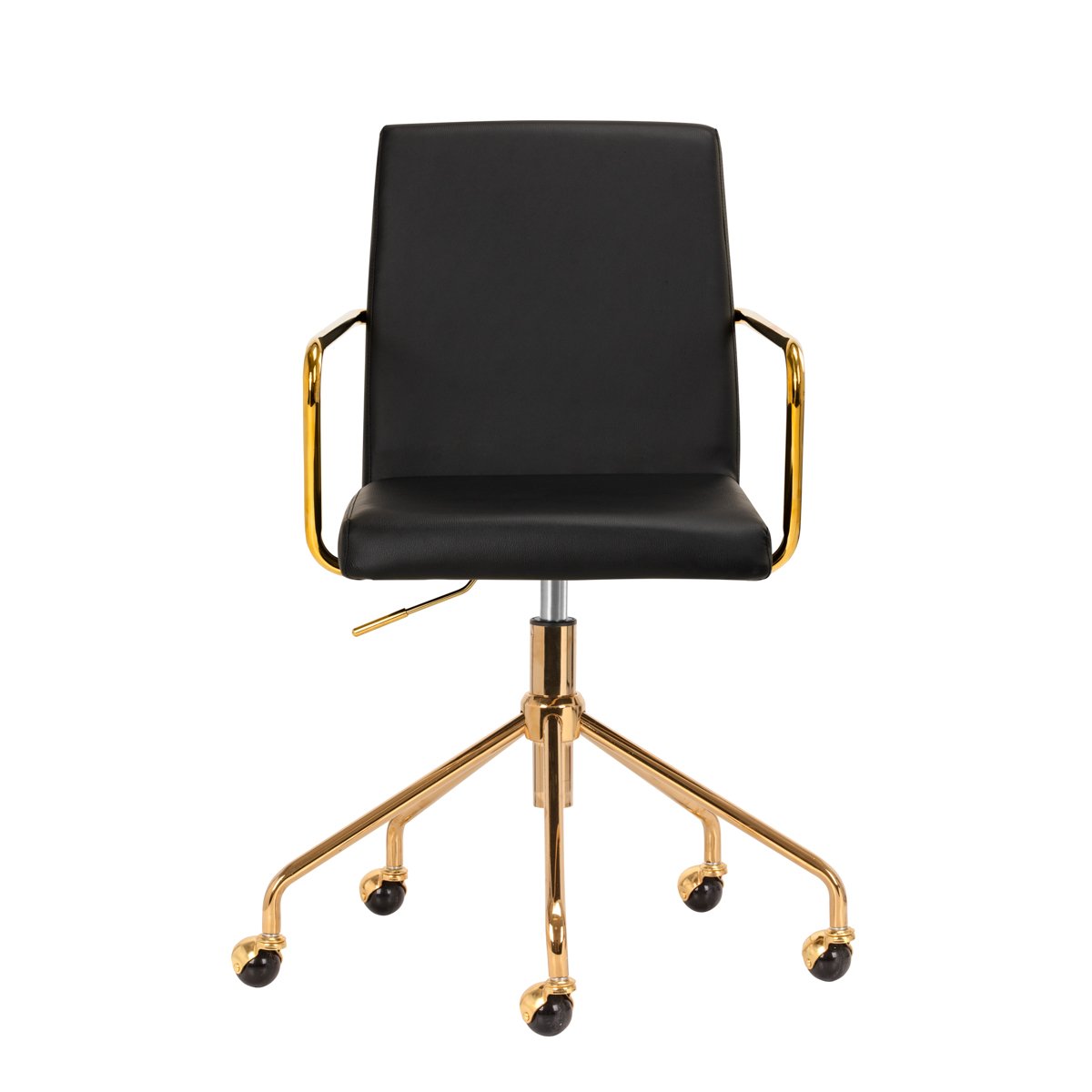 Η ευχάριστη στην αφή ταπετσαρία από συνθετικό δέρμα σε αποχρώσεις του μαύρου δίνει στα έπιπλα έναν μοναδικό χαρακτήρα. Το κομψό φινίρισμα τα καθιστά πραγματικά εντυπωσιακά. Το πλαίσιο σε αποχρώσεις του χρυσού προσθέτει κομψότητα, ταιριάζοντας τέλεια με τα απλά σχήματα. Οι λειτουργικοί τροχοί παρέχουν σημαντική κινητικότητα, διευκολύνοντας την κίνηση της καρέκλας και την κίνηση στο σαλόνι κατά την εργασία. Η αισθητική της κατασκευής, η άνεση χρήσης και η εργονομικά διαμορφωμένη πλάτη καθιστούν την καρέκλα να ανταποκρίνεται στις απαιτήσεις ακόμη και των πιο απαιτητικών χρηστών.