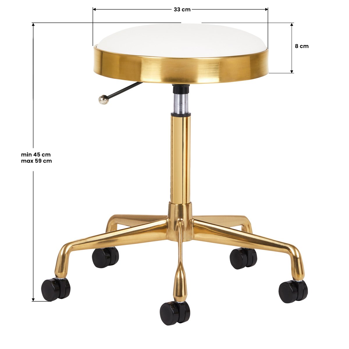 Είναι ένα εξαιρετικό σκαμπό τόσο για ένα σαλόνι ομορφιάς ή ένα κομμωτήριο, όσο και για οικιακή χρήση. Τα χρυσά μεταλλικά στοιχεία έχουν ματ φινίρισμα. Είναι κομψό και φαίνεται όμορφο οπουδήποτε. Λακαρισμένες μεταλλικές επιφάνειες.