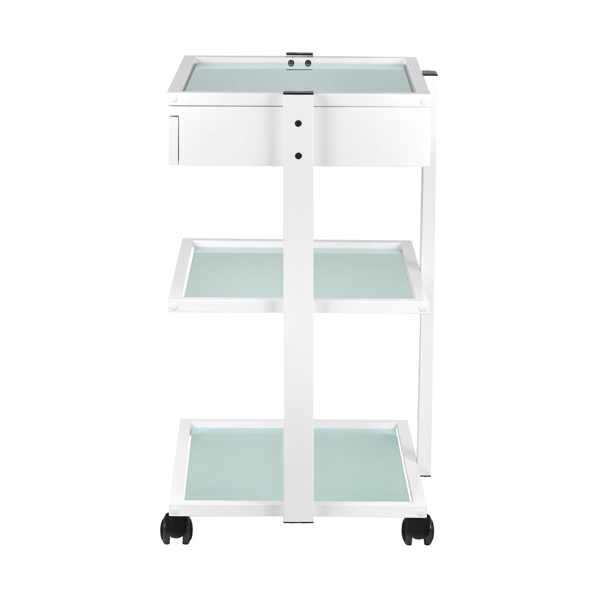 Ένα κομψό μεταλλικό και γυάλινο τραπέζι με ροδάκια από καουτσούκ. Το τραπέζι διαθέτει ένα ευρύχωρο συρτάρι και δύο γυάλινα ράφια με χαραγμένο το λογότυπο GIOVANNI. Στο τραπέζι μπορεί να τοποθετηθεί μεγεθυντικός φακός.