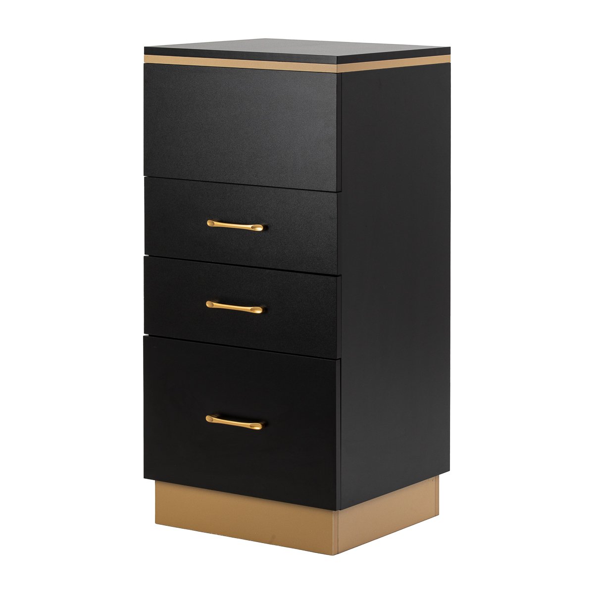 Ο συνδυασμός του κλασικού μαύρου και του χρυσού δίνει στον βοηθό έναν μοντέρνο, αριστοκρατικό χαρακτήρα , που ταιριάζει απόλυτα τόσο σε μινιμαλιστικές όσο και σε πιο εκφραστικές συνθέσεις. Η στιβαρή κατασκευή εξασφαλίζει σταθερότητα , ενώ η λεία επιφάνεια διευκολύνει τη διατήρηση της καθαριότητας των επίπλων. Οι χρυσές λαβές όχι μόνο τονίζουν τον κομψό σχεδιασμό , αλλά εξασφαλίζουν και το άνετο άνοιγμα κάθε συρταριού. Είναι μια πρακτική λύση για ένα κομμωτήριο, όπου η τάξη, η εύκολη πρόσβαση στα εργαλεία και η αισθητική του χώρου εργασίας έχουν σημασία.