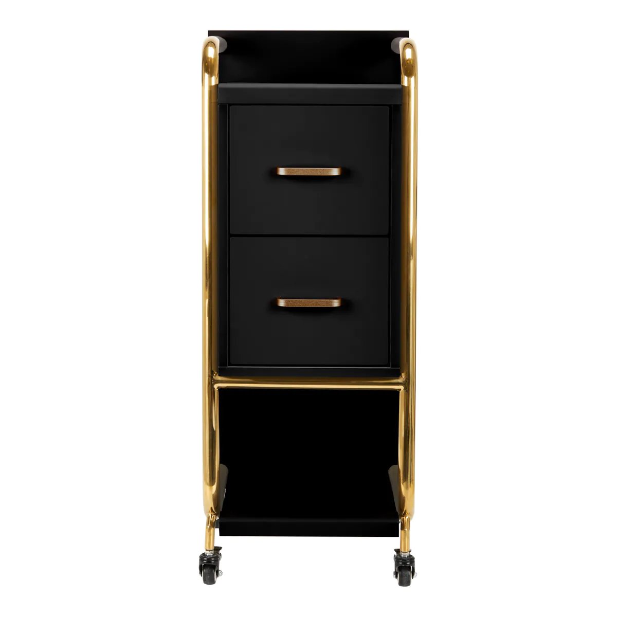Η υψηλής ποιότητας βοηθός κομμωτηρίου Gabbiano Solo είναι ένα κομψό κομμάτι εξοπλισμού, που βελτιώνει σημαντικά την εργασία στο κομμωτήριο. Δύο ευρύχωρα συρτάρια και δύο ράφια διαφορετικών μεγεθών διευκολύνουν σημαντικά την οργάνωση των προϊόντων και των απαραίτητων εργαλείων. Οι ελαστικοποιημένοι τροχοί με φρένα εξασφαλίζουν επαρκή κινητικότητα, η οποία επιτρέπει την τοποθέτηση επίπλων οπουδήποτε στο κομμωτήριο. Ο κομψός σχεδιασμός – γυαλισμένα μεταλλικά στοιχεία σε αποχρώσεις του χρυσού και η σταθερή δομή από ξύλινες σανίδες σε αποχρώσεις του μαύρου – θα τονίσουν τέλεια τον χαρακτήρα των εσωτερικών χώρων .