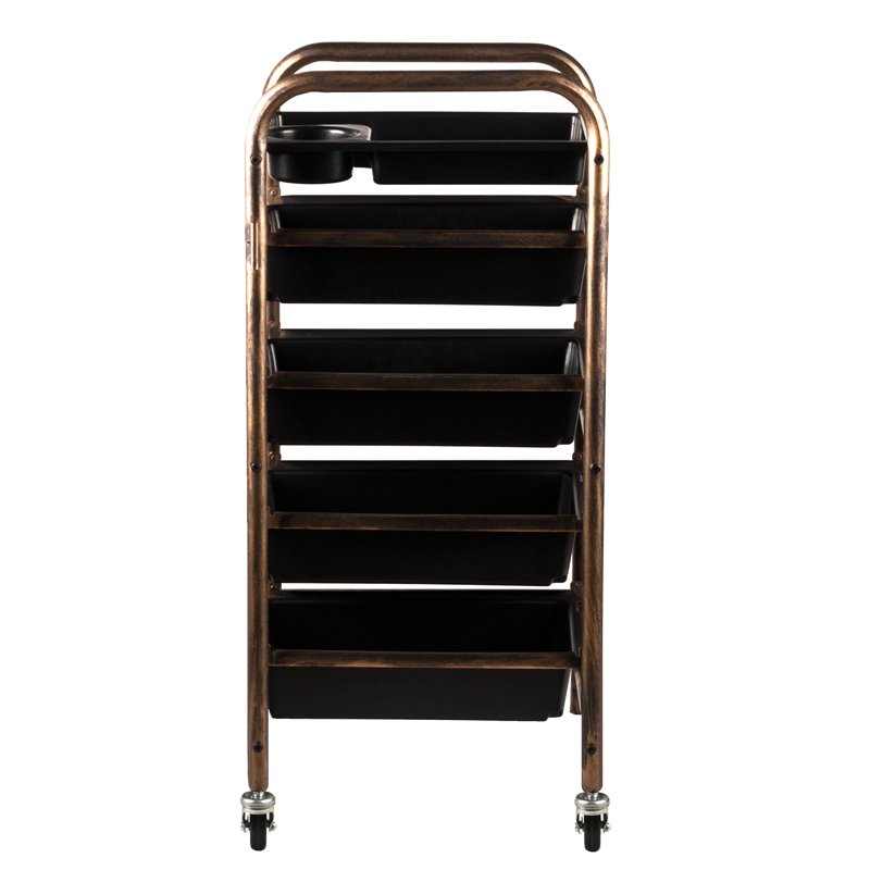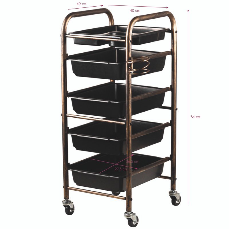 Βοηθός κομμωτή δύο όψεων σε παλιοχρυσό χρώμα, με 4 αμμολεκάνες και θήκες για είδη κομμωτικής. Η σταθερή κατασκευή εξασφαλίζει μακροχρόνια χρήση. Τραπέζι τοποθετημένο σε ελαστικούς τροχούς, χάρη στους οποίους τα εργαλεία θα είναι πάντα πρόχειρα.