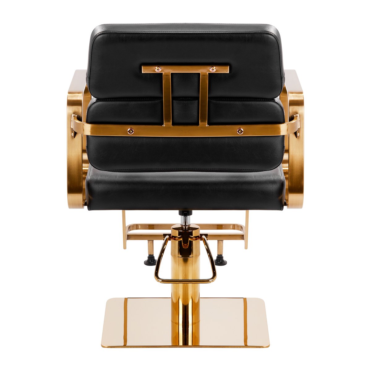 Ο μηχανισμός πλήρους περιστροφής της καρέκλας κάνει την εργασία του κομμωτή πιο αποτελεσματική και άνετη . Μια συμπαγής, επίπεδη, τετράγωνη βάση εγγυάται σταθερότητα κατά τη χρήση. Η ματ φινίρισμα, λεία επιφάνεια δίνει στο στοιχείο μια κομψή εμφάνιση και διευκολύνει τον καθαρισμό . Ένα άνετο κάθισμα με γέμιση αφρού εξασφαλίζει υψηλή άνεση χρήσης , ακόμη και κατά τη διάρκεια πολλών ωρών θεραπειών. Τα γεωμετρικά, μεταλλικά μπράτσα σε αποχρώσεις του χρυσού επιτρέπουν τη σωστή τοποθέτηση των ώμων του πελάτη – αυτό σημαίνει ότι δεν κρύβει το κεφάλι του στους ώμους του ή δεν σκύβει – γεγονός που διευκολύνει πολύ την εκτέλεση ακριβών θεραπειών , συμπεριλαμβανομένων των κουρεμάτων. Ένα κομψό υποπόδιο αφιερωμένο σε αυτό το μοντέλο παρέχει σταθερή στήριξη στα πόδια του χρήστη.