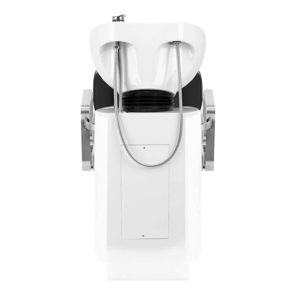 Η καρέκλα με το προφίλ παρέχει επαρκή στήριξη της οσφυϊκής χώρας και, ως εκ τούτου, υψηλή άνεση χρήσης. Τα μεταλλικά υποβραχιόνια σε αποχρώσεις χρωμίου με γεωμετρικό σχήμα επιτρέπουν τη σωστή τοποθέτηση των ώμων του πελάτη . Η γέμιση με ανθεκτικό, ανθεκτικό στις παραμορφώσεις αφρό και η ταπετσαρία από ευχάριστο στην αφή συνθετικό δέρμα σε αποχρώσεις του μαύρου εξασφαλίζουν την ανθεκτικότητα των επίπλων, την ευκολία καθαρισμού και την άνετη χρήση για μεγάλο χρονικό διάστημα . Η πρωτότυπη, κομψή εμφάνιση της μονάδας πλύσης μαλλιών δίνει στο εσωτερικό μια μοναδική έκφραση. Το σετ περιλαμβάνει πλήρη εξαρτήματα σε αποχρώσεις χρωμίου, όπως βρύση, κεφαλή ντους και ειδικούς σωλήνες για να παρέχουν ένα πλήρες σετ εργαλείων για εργασία .