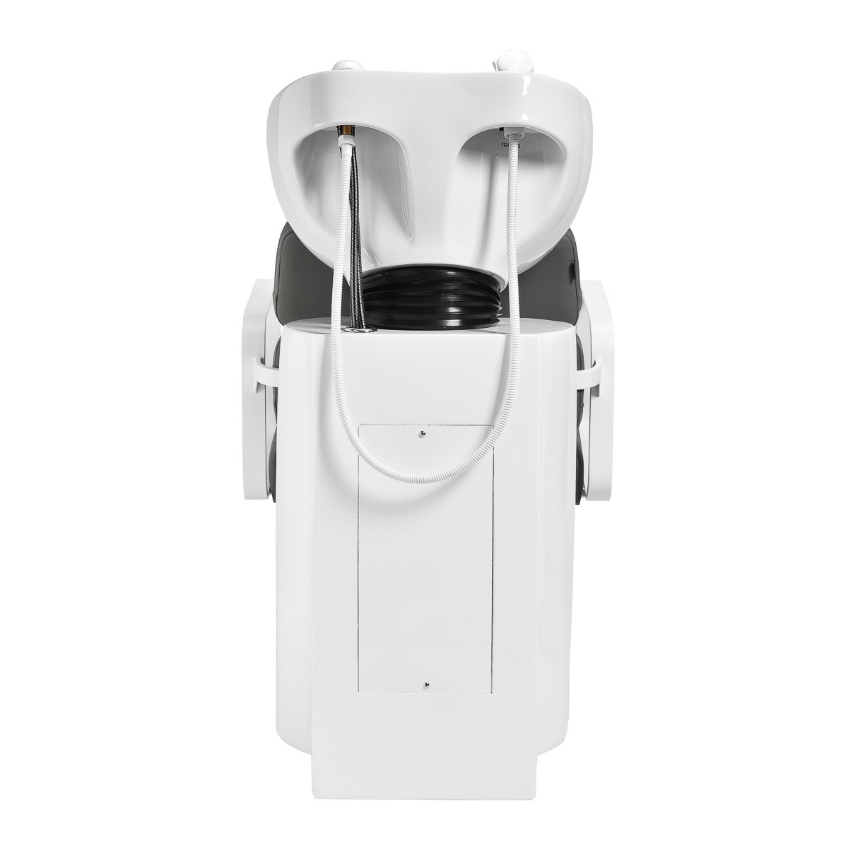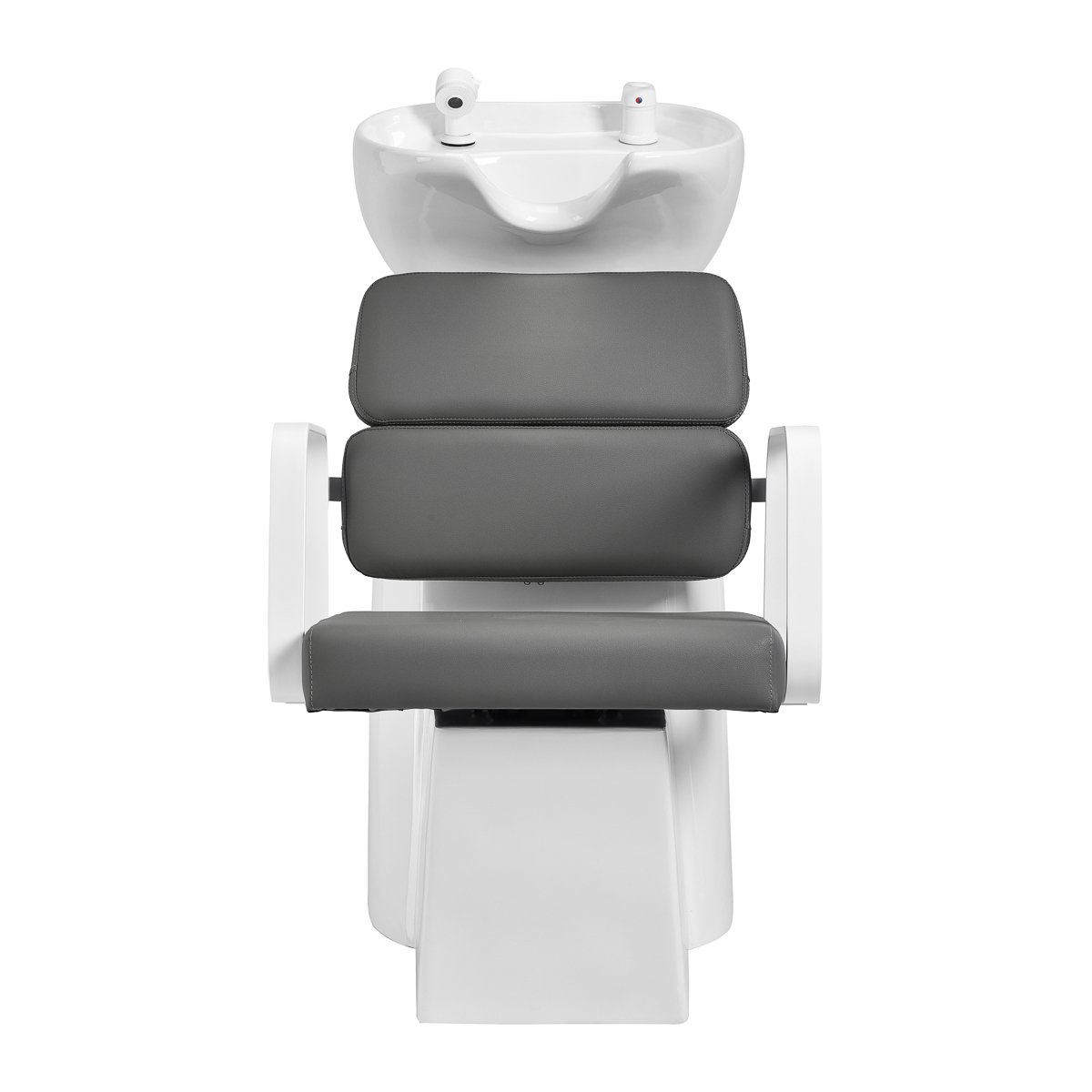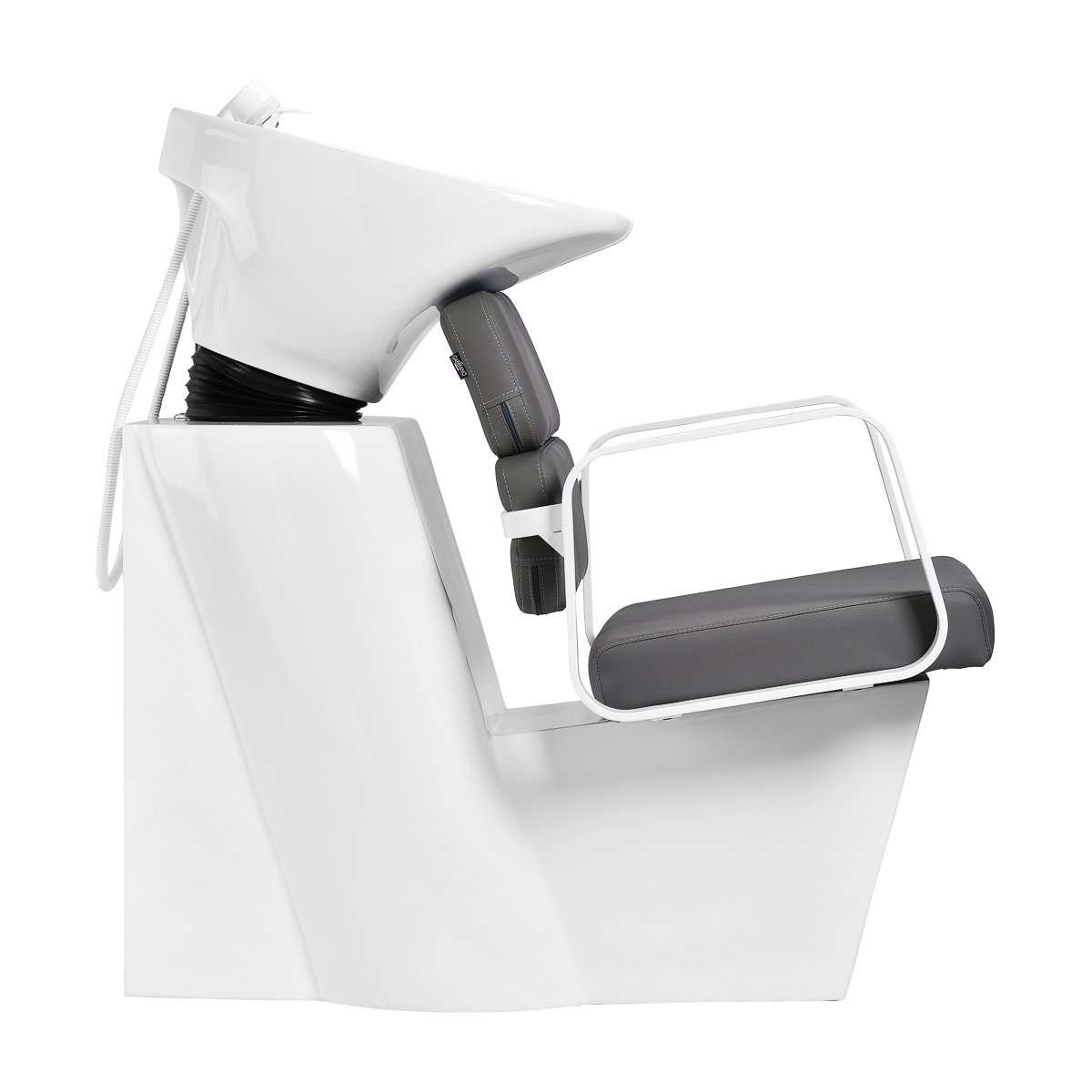 Η καρέκλα με το προφίλ παρέχει επαρκή στήριξη της οσφυϊκής χώρας και, ως εκ τούτου, υψηλή άνεση χρήσης. Τα μεταλλικά υποβραχιόνια σε αποχρώσεις του λευκού με γεωμετρικό σχήμα επιτρέπουν τη σωστή τοποθέτηση των ώμων του πελάτη . Η γέμιση με ανθεκτικό, ανθεκτικό στις παραμορφώσεις αφρό και η ταπετσαρία από ευχάριστο στην αφή συνθετικό δέρμα σε αποχρώσεις του γκρι εξασφαλίζουν την ανθεκτικότητα των επίπλων, την ευκολία καθαρισμού και την άνετη χρήση για μεγάλο χρονικό διάστημα . Η πρωτότυπη, κομψή εμφάνιση της μονάδας πλύσης μαλλιών δίνει στο εσωτερικό μια μοναδική έκφραση. Το σετ περιλαμβάνει πλήρη εξαρτήματα σε αποχρώσεις του λευκού, όπως βρύση, κεφαλή ντους και ειδικούς σωλήνες για να παρέχουν ένα πλήρες σετ εργαλείων για εργασία .