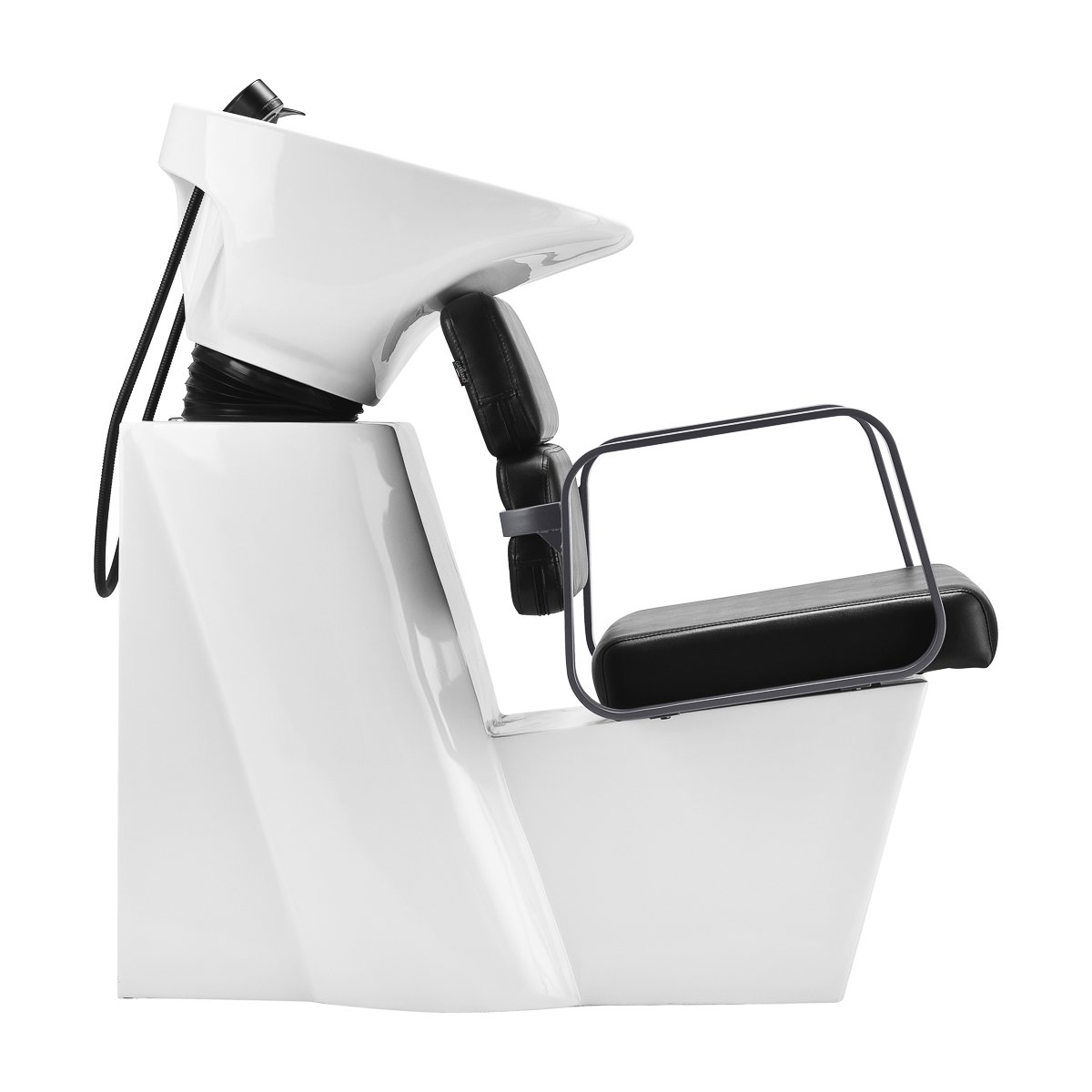 Το κατάλληλο βάθος του λευκού κεραμικού νιπτήρα αποτρέπει την υπερβολική πιτσιλίσματα νερού ή προϊόντων που χρησιμοποιούνται κατά τη διάρκεια των θεραπειών. Αυτό επιτρέπει την άνετη και αποτελεσματική εκτέλεση ενός ευρέος φάσματος υπηρεσιών. Η γωνία του νιπτήρα μπορεί να ρυθμιστεί, διευκολύνοντας την προσαρμογή του στις ατομικές ανάγκες . Η υψηλή ποιότητα των υλικών που χρησιμοποιούνται καθιστά τον νιπτήρα ανθεκτικό, ανθεκτικό σε αποχρωματισμούς και γρατζουνιές και πολύ εύκολο στον καθαρισμό . Ένα σωστά διαμορφωμένο κολάρο και η κεκλιμένη πλάτη παρέχουν στήριξη και άνεση κατά το λούσιμο των μαλλιών, και χάρη στην άνετη μαύρη πλαστική επένδυση , ο πελάτης δεν θα νιώσει την δυσάρεστη αίσθηση της κρύας κεραμικής επιφάνειας.
