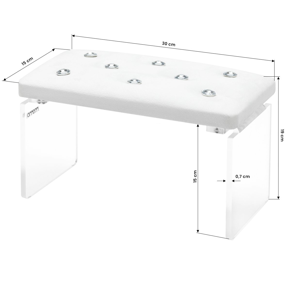 Το κατάλληλο ύψος της στήριξης εξασφαλίζει μια άνετη θέση τόσο για τον πελάτη όσο και για τον στυλίστα. Η σωστή στάση του στυλίστα ελαχιστοποιεί την καταπόνηση της σπονδυλικής στήλης , μειώνοντας αποτελεσματικά τον πόνο στην πλάτη, ενώ ο πελάτης απολαμβάνει μεγαλύτερη άνεση και χαλάρωση . Στοιχεία σιλικόνης στα πόδια προστατεύουν την επιφάνεια του τραπεζιού από γρατζουνιές και εμποδίζουν την ολίσθησή της στο τραπέζι, εξασφαλίζοντας σταθερότητα. Το πλαστικό πλαίσιο και το κομψό βελούδο εξασφαλίζουν τη μακρά ανθεκτικότητα του προϊόντος, ενώ τα διακοσμητικά κρύσταλλα του δίνουν μια μοναδική εμφάνιση.